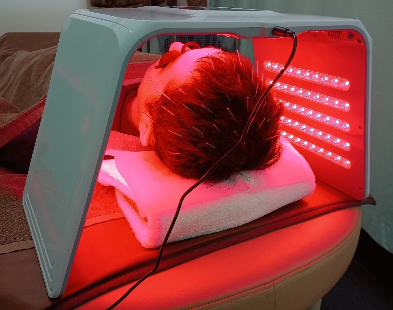 当院の育毛鍼灸はLEDライトの力で自己再生力を引き出す「LEDコラーゲンマシン」を利用した光治療がセットとなっております。